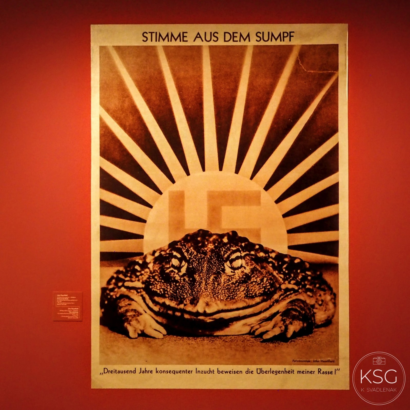 The exhibit ends with a strong criticism of the hateful racism of the NAZI regime that brought the world World War II. John Heartfield (actually Helmut Herzfeld) is credited with being the first artist to create political montage. The meaning of his toad illustration for the Arbeiter Illustrierte Zeitung (workers´illustrated paper) from 1936, printed in exile in Prague, is quite clear with its message: