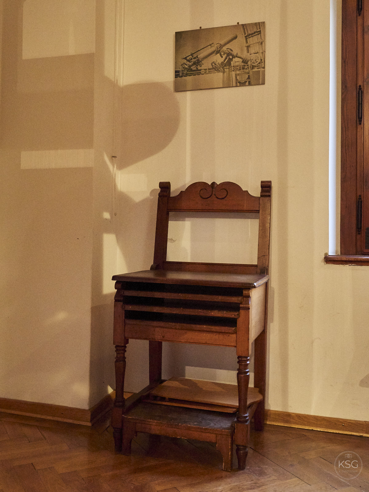 The rooms contain much of the original furniture, and almost all the floors are original parquet as well. Charmingly, there are two beds that kind of resemble posh deck chairs that were used by astronomers to look through the refractor — they needed to lie down and could adjust their position by pulling on some ropes. Usually they would be lying there all day during their scientific efforts, so having a comfortable spot was quite essential! Another little detail I liked is a sort of adjustable high chair, a nifty low-tech solution to the problem of having to adjust the sitting position to different levels depending on where the telescope had to be pointed. I think some of our modern-day furniture stores may have copied this concept…