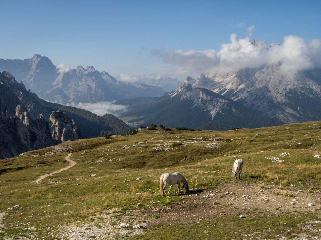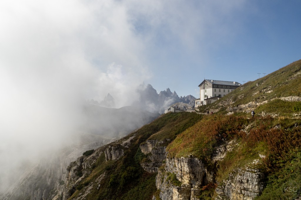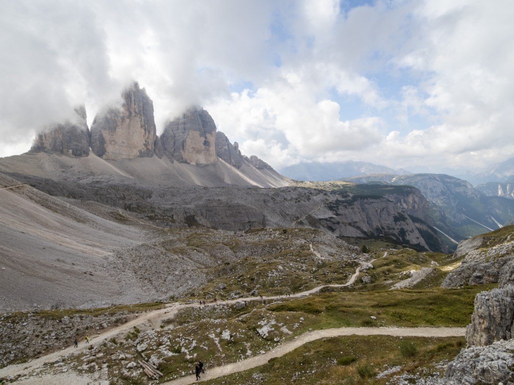 We hiked around the Drei Zinnen on a well trodden trail from the Auronzo hut (inaugurated as “Prince Umberto Hut” in 1925), which can easily be reached by public bus from the valley below. We shared the trail with many many other hikers on that sunny September Sunday. (Nevertheless, it was possible to keep our safe Covid-19 distance.)
