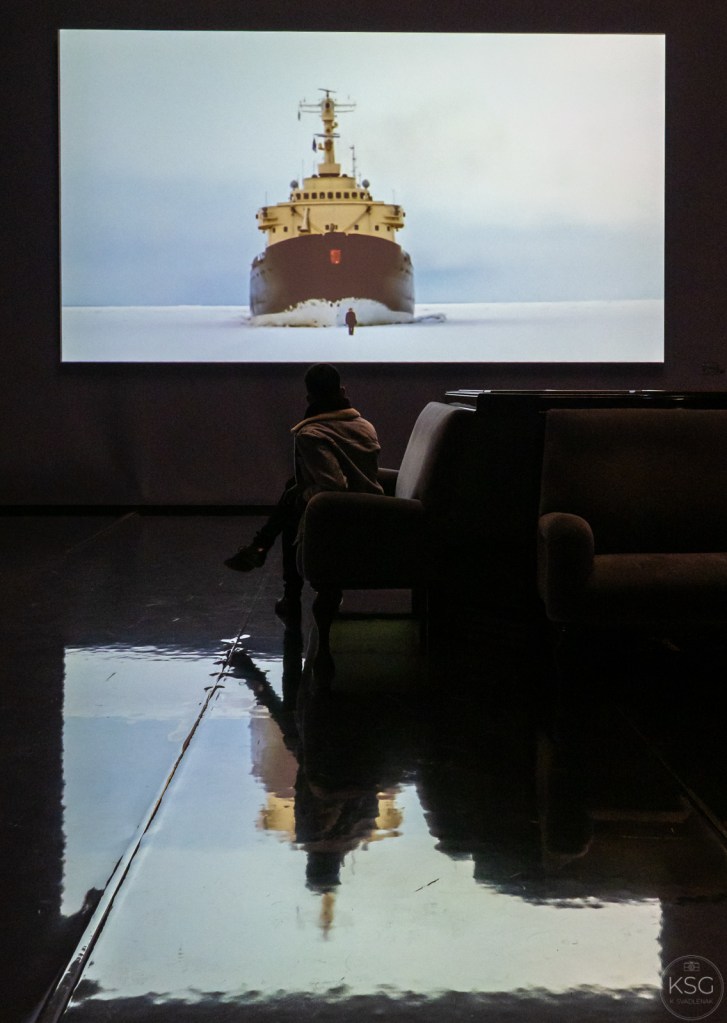 An entire wall of that room is dominated by a video installation by Guido van der Werve. In it, we see the artist himself walking towards us, threatened by a giant ice breaker moving silently toward him. The exhibit is meant as a metaphor for the risk of failure, and the courage needed to heroically create beauty.