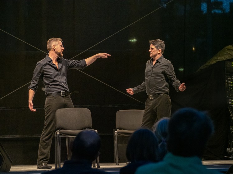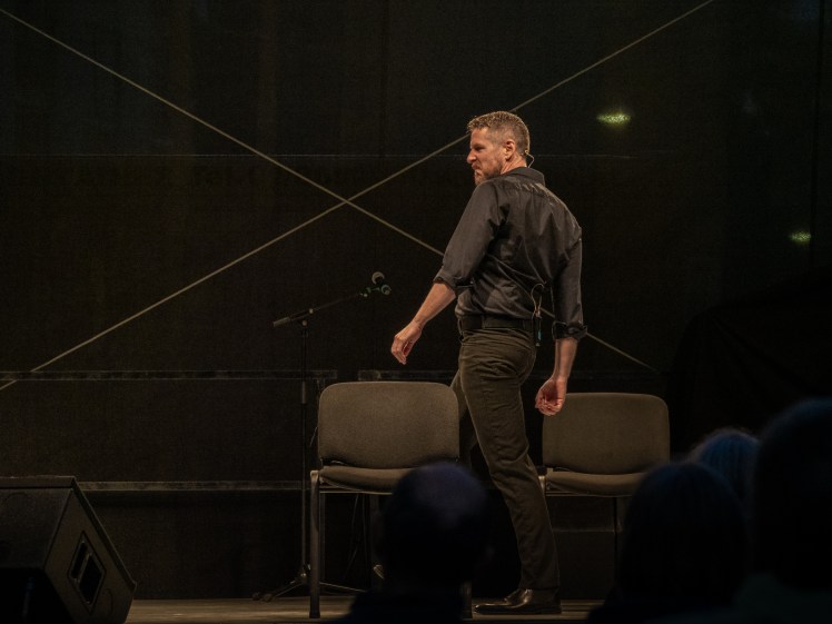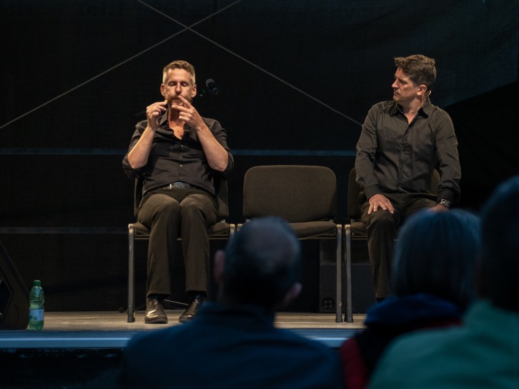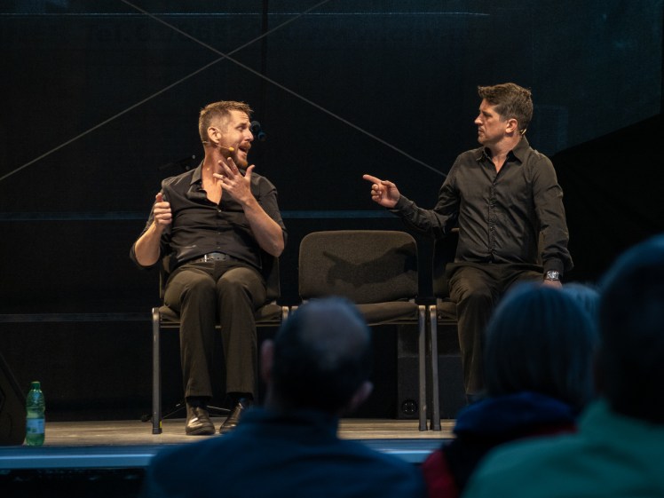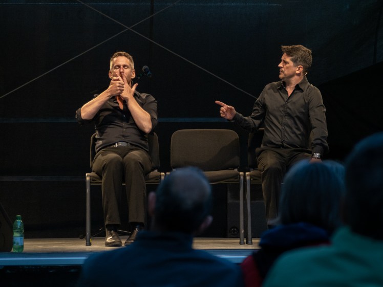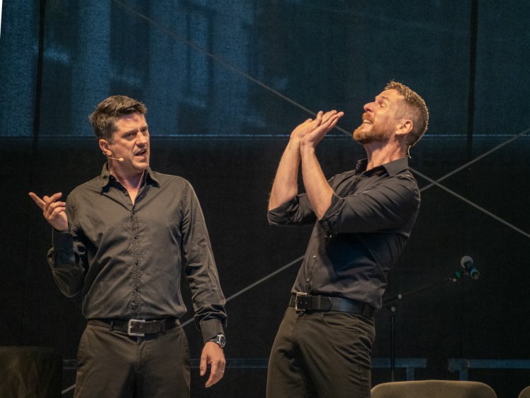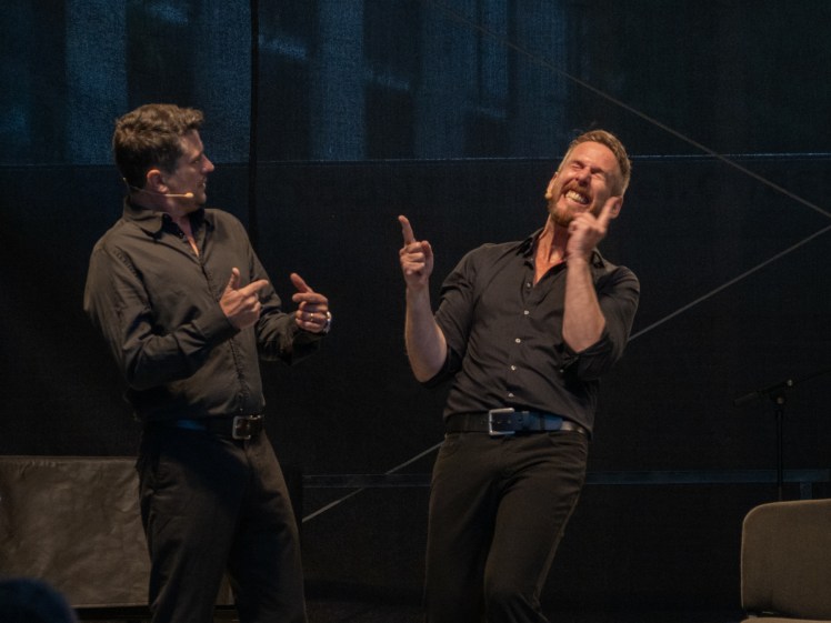 Oh, we found ways around that. There was a podcast show that Michael and I did, on Youtube “It should be about something“. We did 50 episodes. We got quite a bit of a fanbase, they started a Facebook group, and when we were on a break, every Thursday they posted “it´s a sad Thursday, when will “It should be about something come back?”. And this show that Mike and I were doing, we used it to teach ourselves the technology, about cameras, and lighting, and how to use editing software, including live editing software, and how can be broadcast, and so when Christmas time rolled around and we went into the theatre we had a chance to bring a lot of experience and with the technicians there we created a show that was live every night, and the audience could communicate with us in a way, and we had three cameras, and the show was made for the screen. So you could watch it in your home. And then in spring we did it again, but in a completely different way and with a different technical system, and so that was really incredible. That was something that came out of the pandemic I think that was a big plus. Having a chance to explore that thing that we never explored before, and having an understanding of a thing that´s never going to go away.