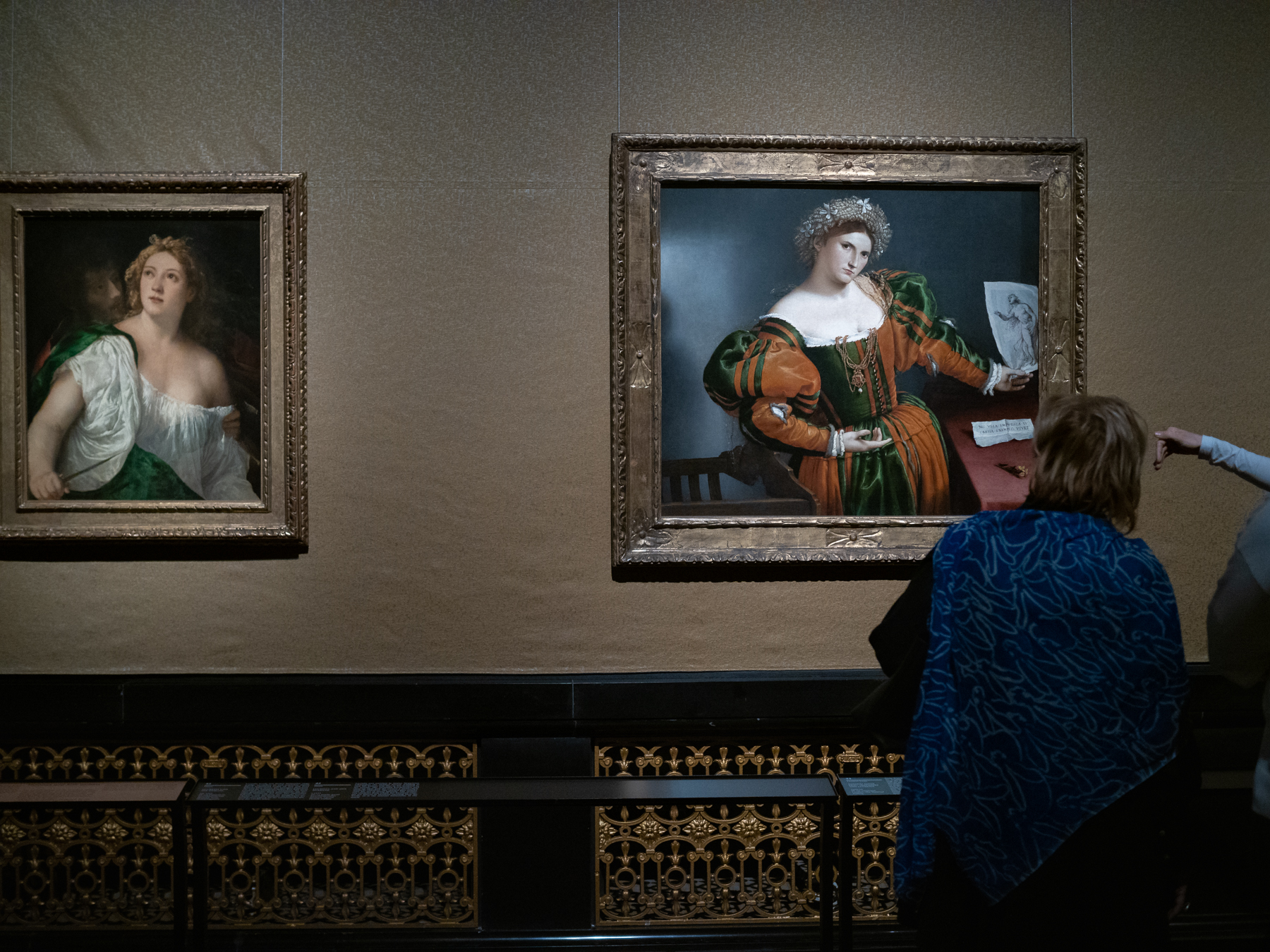 The role of most women in Titian’s day was, unsurprisingly for the time, subordinate to that of men, and very few of these painters´ subjects can today be identified by name. They thus bear titles such as “The Beauty” or “Woman with a Plumed Hat” (sadly no photography permit for that one). For some female subjects there are theories as to who they may have been, but this is rare. The focus is on the painterly qualities of these portraits, the use of light and colours, the idealising style — sometimes depicting the women as classical deities, such as Flora, the goddess of flowers, or the lovers of gods, and often as characters from mythology. The exhibition has its critics: for some, it is too romantic, not feminist enough, does not make sufficiently evident the social conditions under which women lived in the Renaissance (see, for example, an interview (in German) with Lea Singer, author of “La Fenice” that deals with the darker side of Venice during Titian´s time).