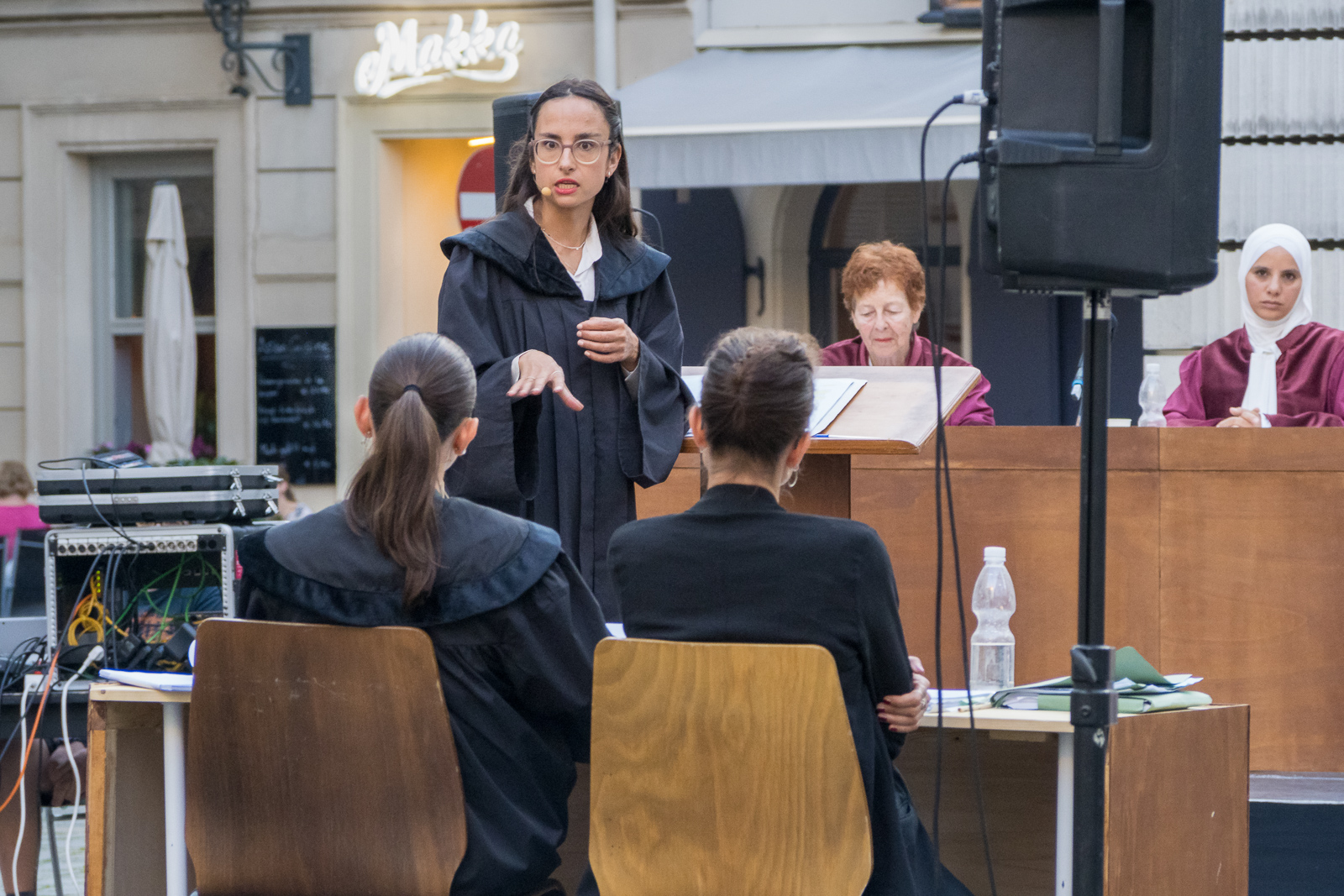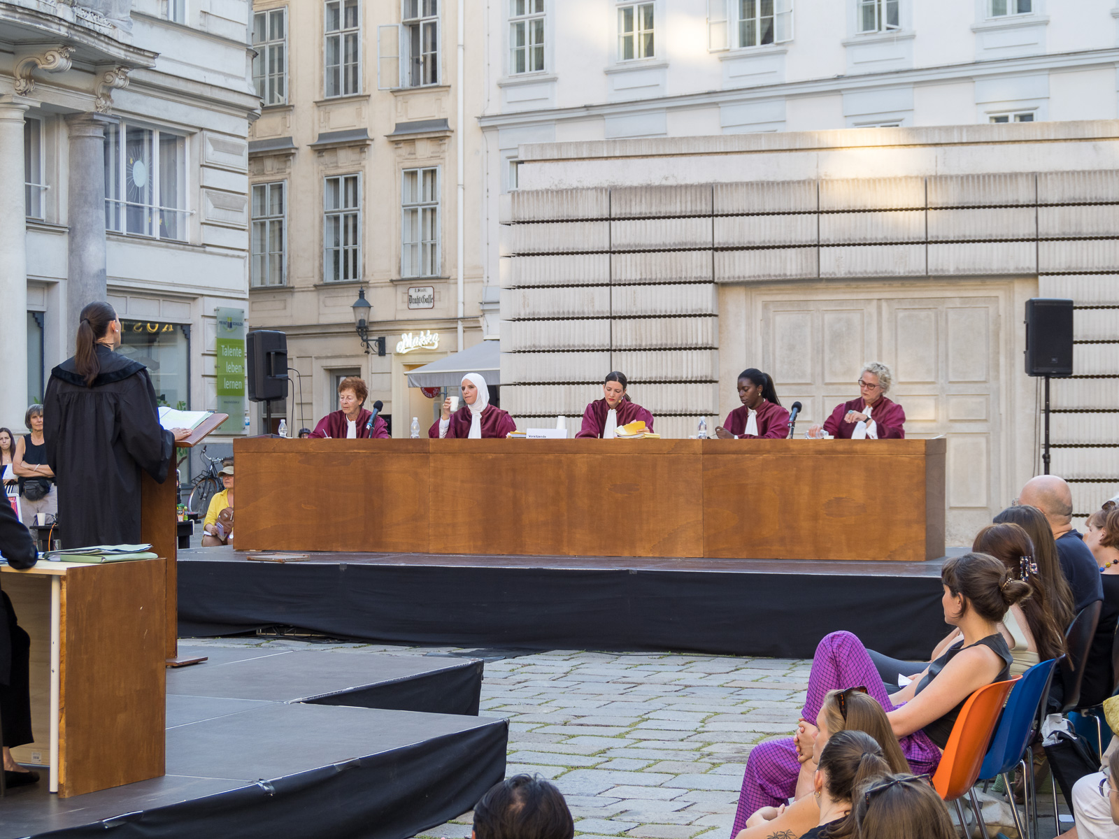 Asyl Tribunal – Klage gegen die Republik (Asylum Tribunal – The Case against the Republic), is a staged public court case by Theaterkollektiv Hybrid in cooperation with Werk X-Petersplatz, directed by Alireza Daryanavard. Based on actual occurrences in Austria, this symbolic tribunal questions and looks at the justices and injustices of the Austrian asylum system. In a multi-day show process, the State and the Defense make their case in front of an audience and in front of a fictitious tribunal of judges (if only our courts really looked like this in terms of composition of judges!). The problems being discussed are real, the setting is theatrical. A series of suspenseful evenings in Vienna´s Judenplatz, open air and freely accessible to all.