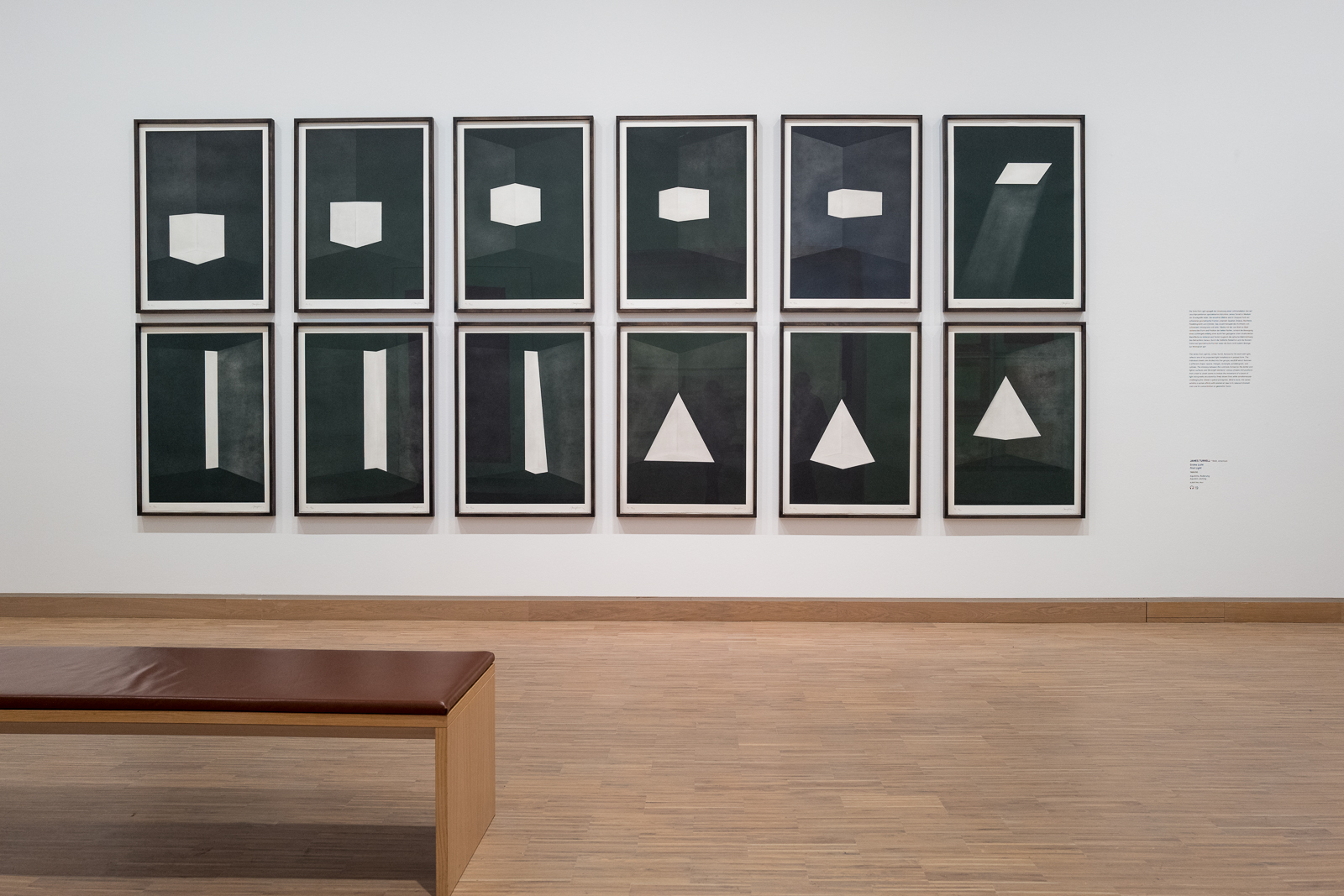 But not everything in this exhibition is so colourful, many of the works are monochromatic with a strong focus on graphic elements. For example, the “First Light” print series (see in the gallery below) is a set of etchings created by James Turrell in 1989. The prints were created using a technique known as aquatint etching, which involves creating a textured surface on the printing plate using a fine dust of resin or powder. The plate is then immersed in an acid bath, which etches the surface of the plate in a way that creates tonal variations and depth. The plate is inked and printed onto paper, creating the final image.
