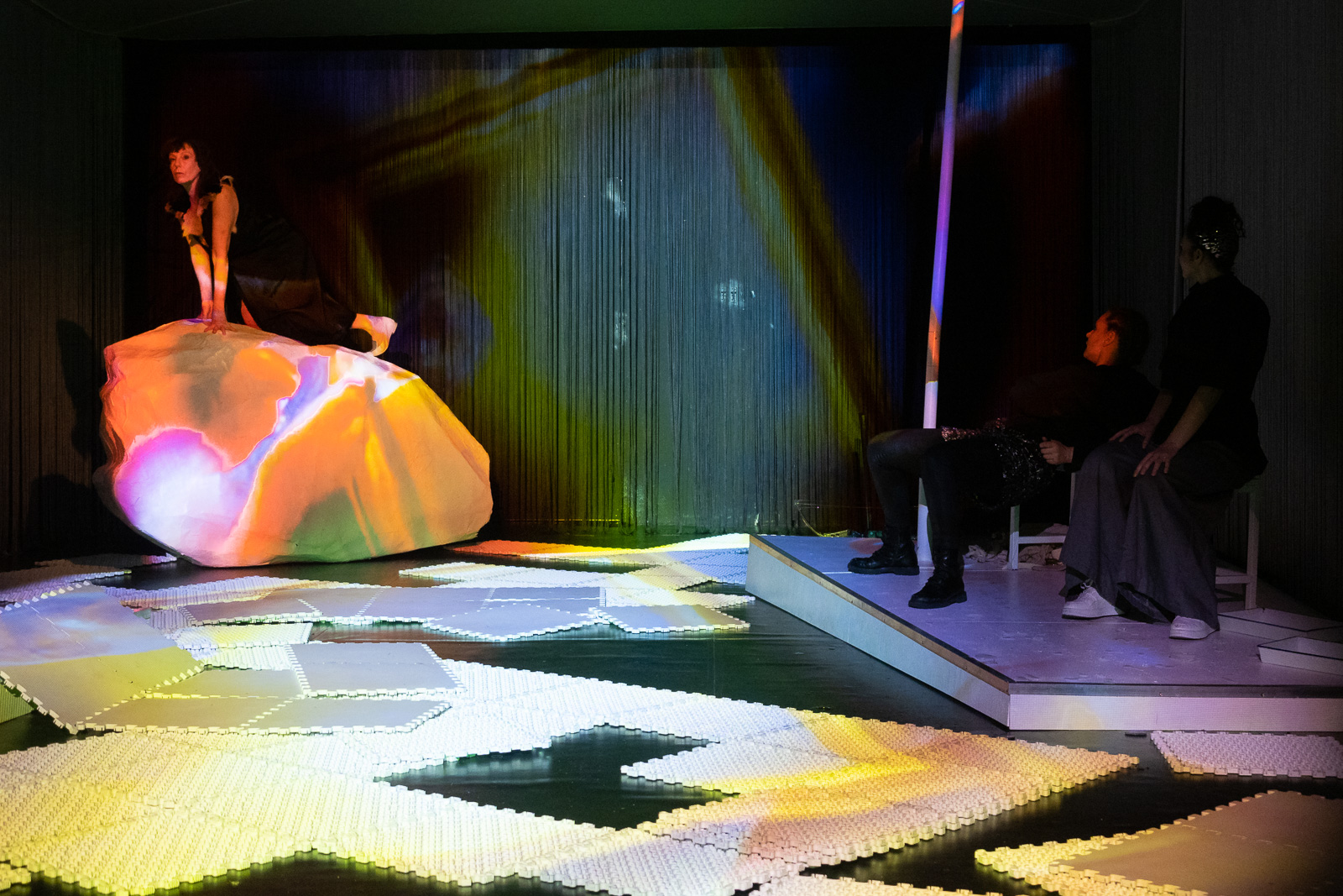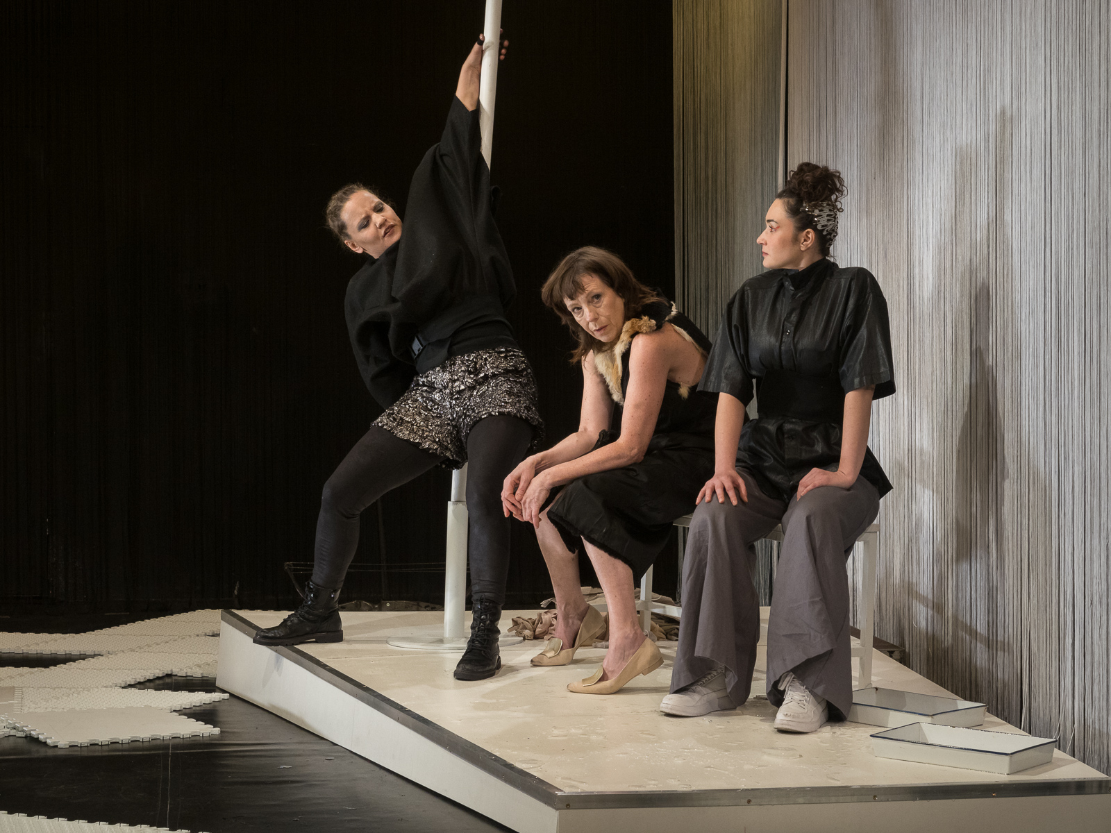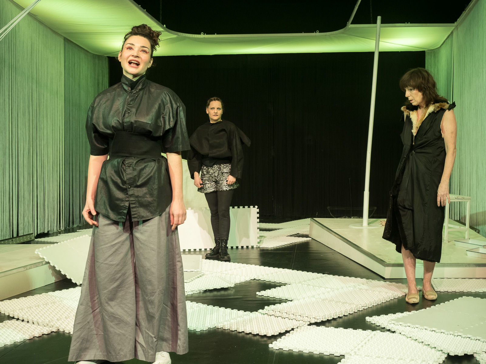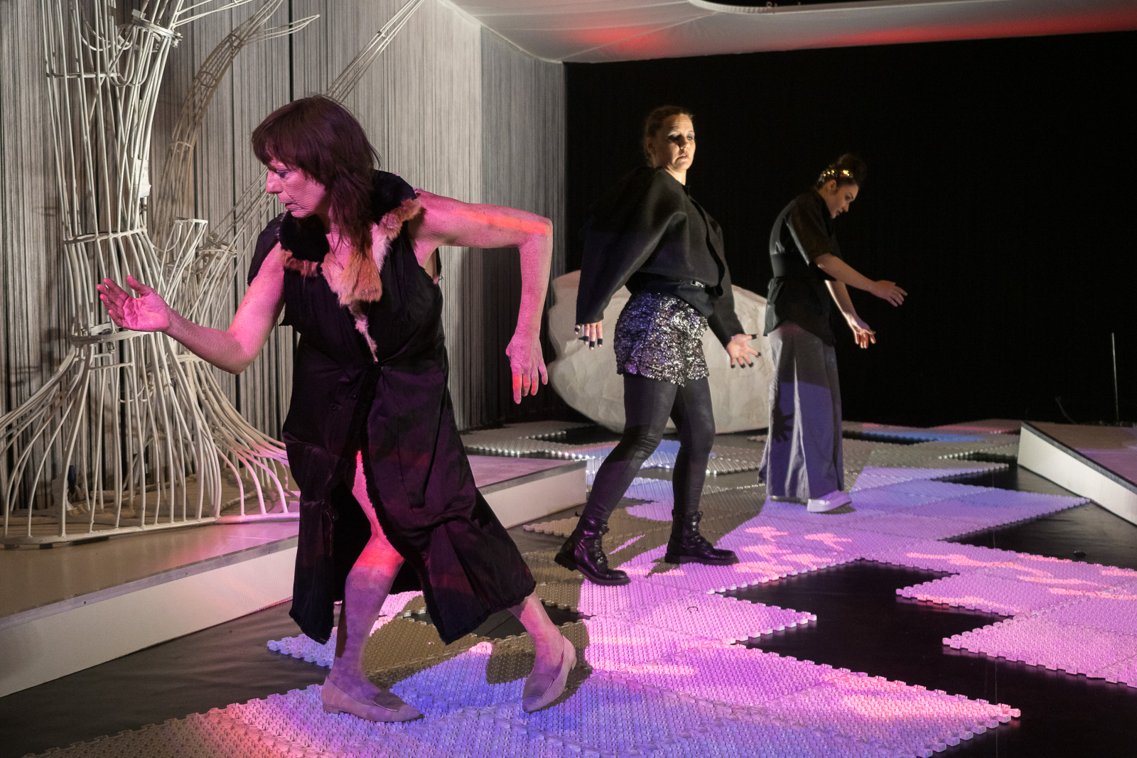 The play’s format is a combination of conversations, performative, and dramatic elements, including sound, projections, and music. The play’s form with three women from different walks of life who nevertheless find connection in the “wilderness” they meet in creates a constellation that exists outside of time. As they question each other and their reality, relate their past and experiences, they point up the need for a different kind of storytelling that can lead to a new and more inclusive future.
