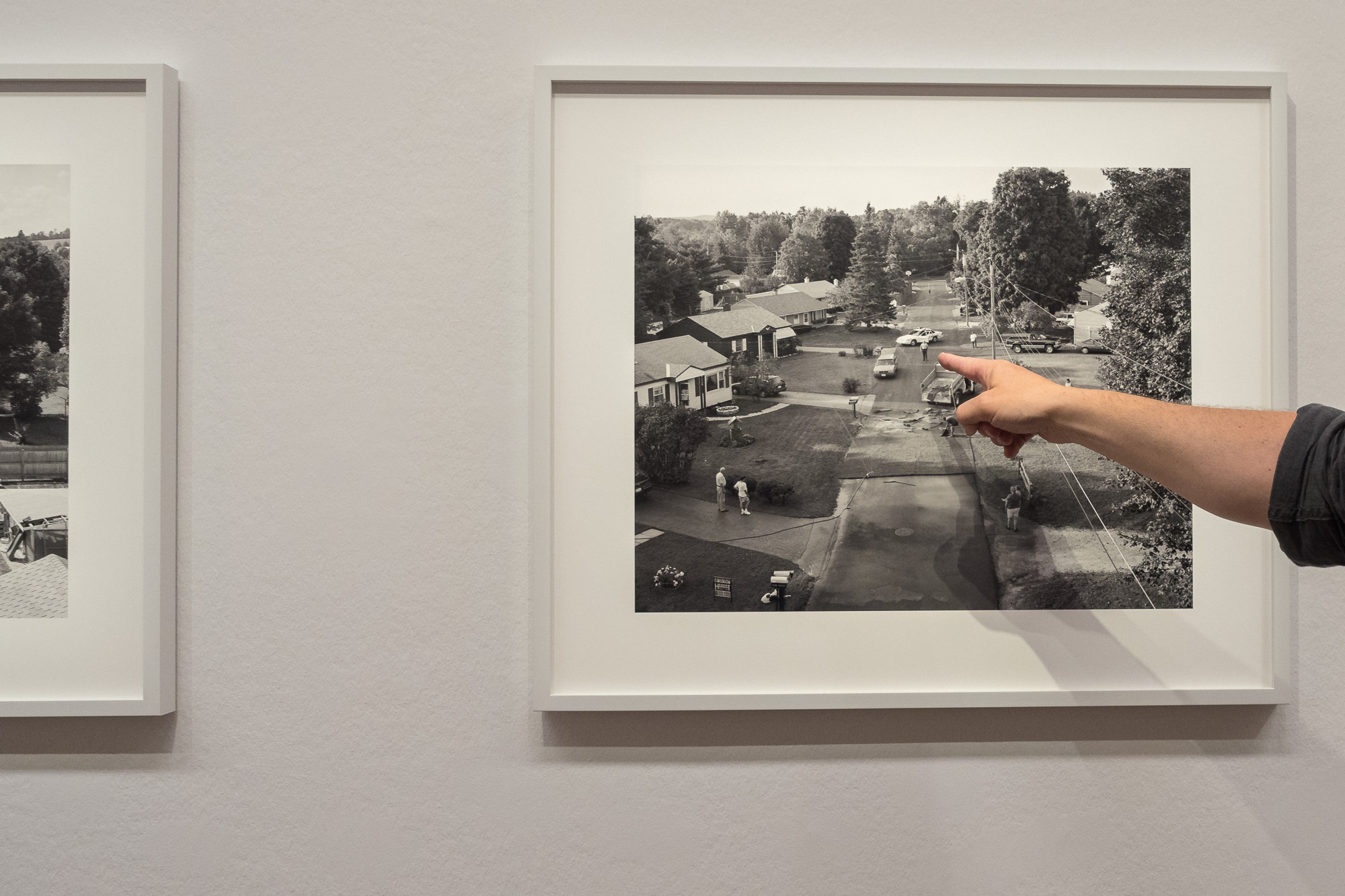 The exhibition spans Crewdson’s entire career, including works from his most famous series, such as “Twilight” (1998-2002), “Beneath the Roses” (2003-2008) , and his most recent series “Eveningside”. “Twilight” features unsettling scenes of domestic life, often bathed in an unnatural twilight glow, while “Beneath the Roses” delves deeper into the darkness, exploring themes of loss, despair, and the fragility of the American Dream. In the – unusually – black and white series “Eveningside” his theme is again the disconnect of individual experiences, with vibes from the film noir genre of the 1940s and 50s.