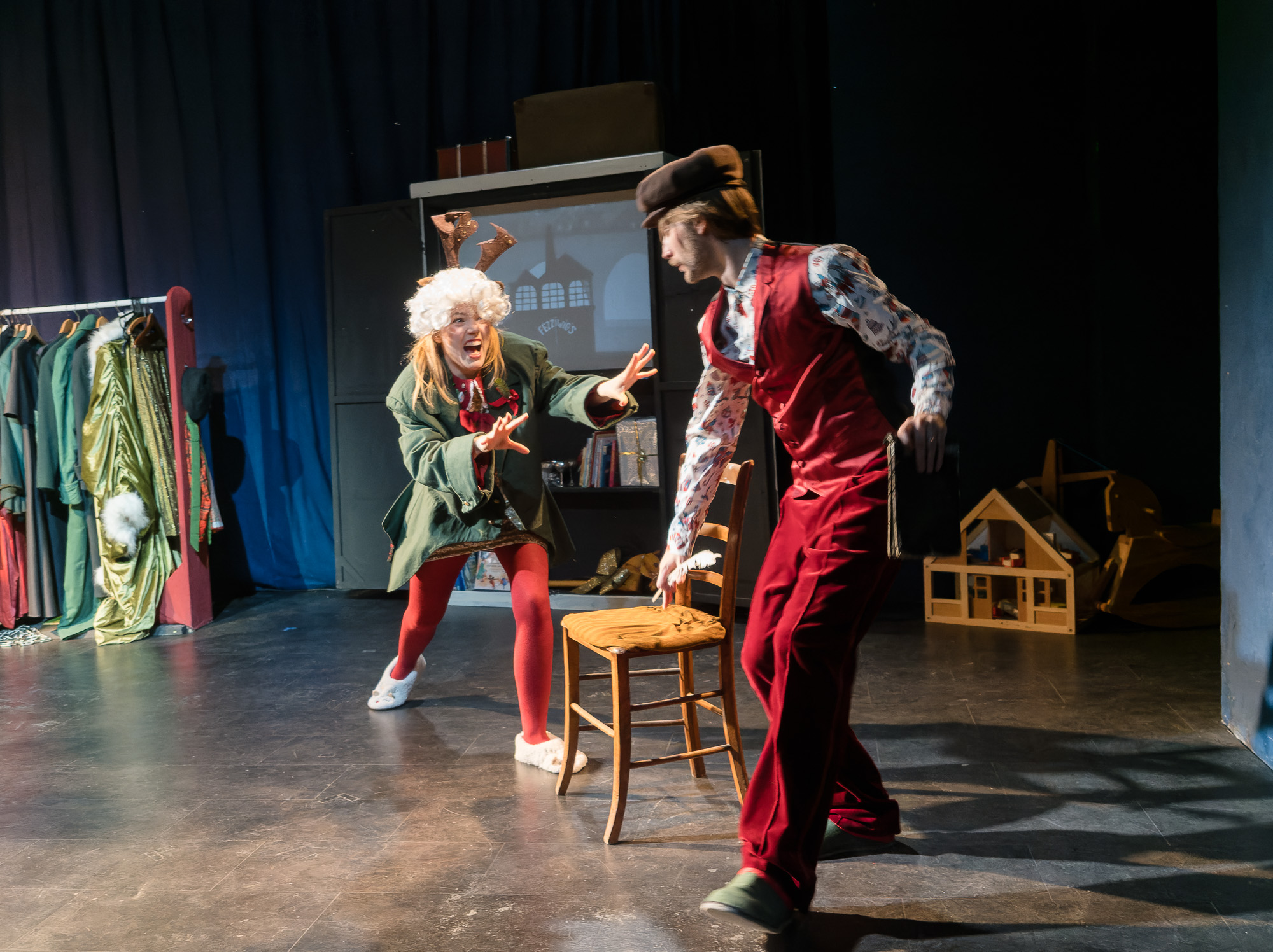 Alan Burgon as director has put a creative storytelling frame around the old tale, which lightens it up and makes for many amusing asides. The cast is brilliant as ever, with Dave Moskin as grumpy Scrooge and uncle Eddy, and all other cast members in multiple roles. Lisa Sigismondi truly shines as Steph, Fan, Tiny Tim and drunken party guest, Lisa Gray does a wonderful interpretation of the mother and some ghostly appearances, while Sam Kozeluh is wonderful as loving father and forgiving nephew Fred. Emily Busvine is a very jolly ghost of “Christmas present” and somewhat drunk house guest.